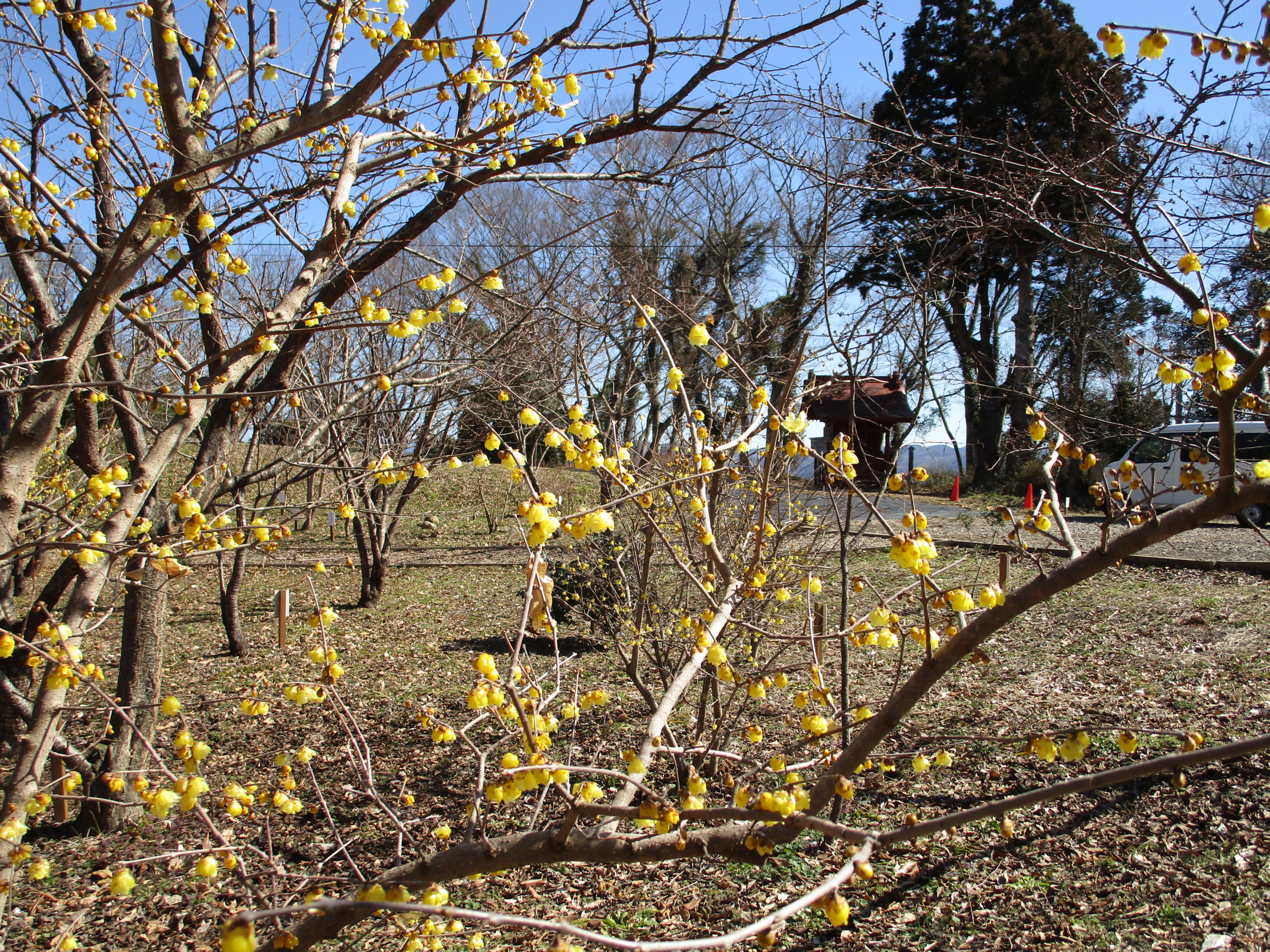 花木エリアでは、ロウバイが見ごろを迎えました。青空に黄色の花が映えてとても美しいです。