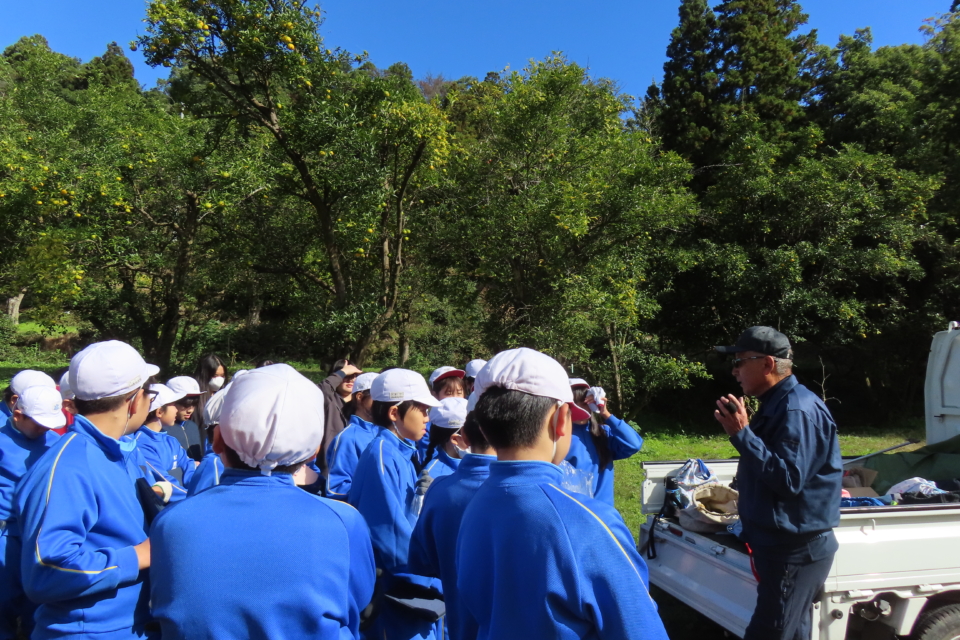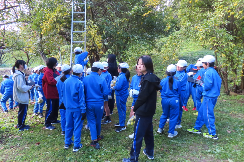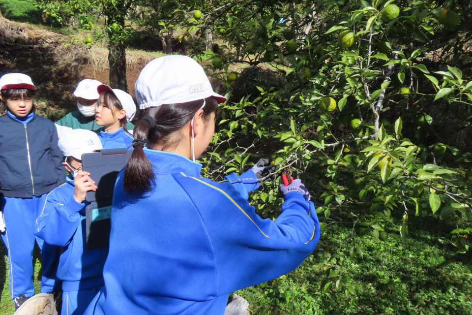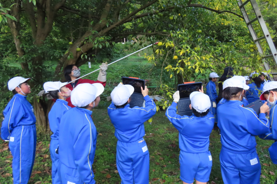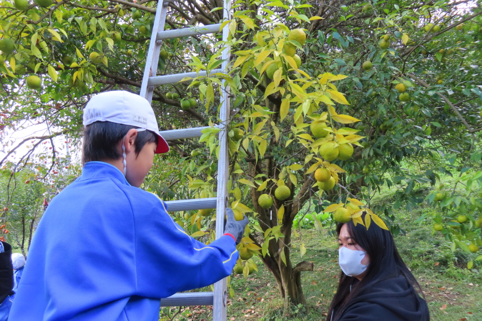 柚子農家曳地さんの指導を受け、黄色く色づいてきた柚子を収穫しました。